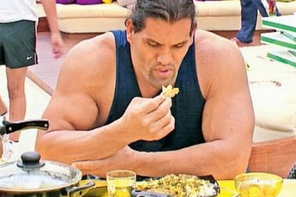 The Great Khali's lunch includes curry, pulses, vegetables, wheat bread, rice, a kilogram of chicken, eggs along with some more dry fruits. While for dinner, the former WWE star eats cheese, legumes, vegetables, 10 wheat bread, brown rice, chicken and six eggs followed by two liters of milk with ice post-dinner.