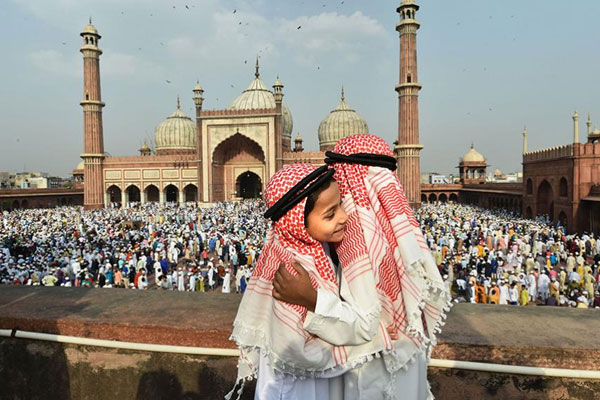Young boys seen greeting each other after offering 'namaz' on the occassion of Eid-ul-Fitr at Jama Masjid in New Delhi.