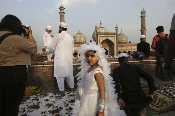 A girl arrives with her family in a celebratory dress to offer Eid al-Fitr prayers at the Jama Masjid.
