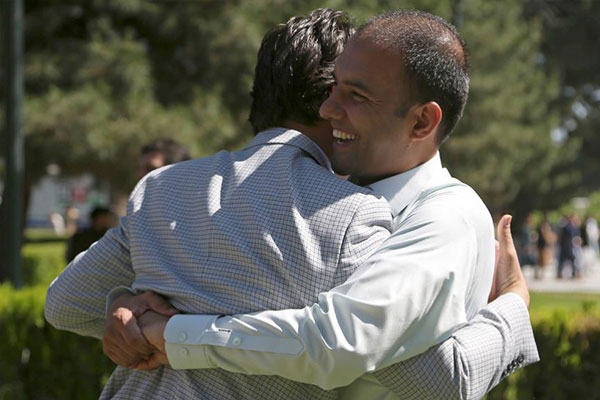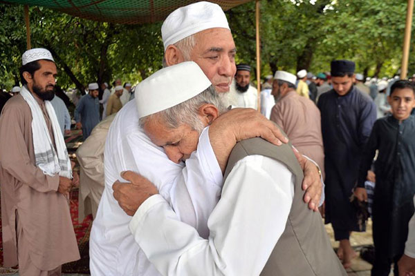 Men hug each other after offering Eid al-Fitr prayers during the Eid al-Fitr at the presidential palace in Kabul, Afghanistan.