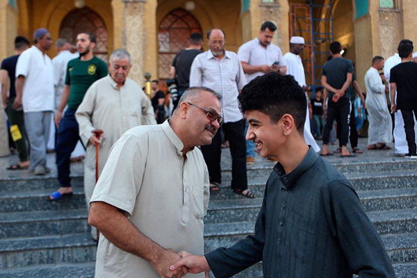 After prayers on the first day of Eid al-Fitr holiday, Muslims greet each other at the 17th of Ramadan mosque in Baghdad, Iraq.