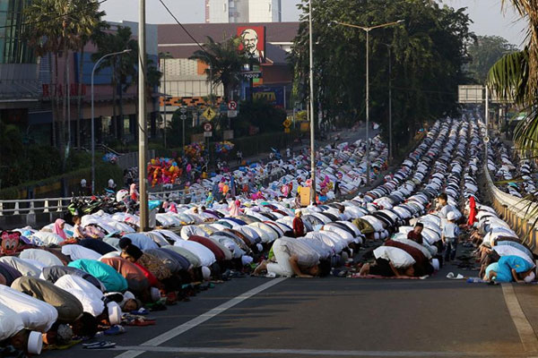 Indonesian Muslims perform Eid al-Fitr prayer that marks the end of the holy fasting month of Ramadan in Jakarta, Indonesia.