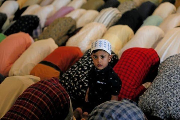 A boy looks on as Muslim men attend Eid al-Fitr prayers in Colombo, Sri Lanka.