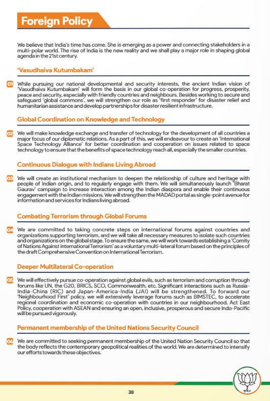 In terms of 'Foreign Policy,' the manifesto explicitly states the party's outlook regarding India's global standing and states, "We believe that India's time has come. She is emerging as a power and connecting stakeholders in a multi-polar world. The rise of India is the new reality and we shall play a major role in shaping global agenda in the 21st century."