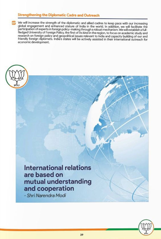 PM Modi in the manifesto says: “International relations are based on mutual understanding and cooperation.”