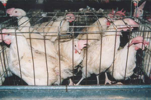 Chicken are crammed inside a tiny filthy  shed with thousands of other birds, each getting less space. This leads to intense crowding and outbreak of disease.